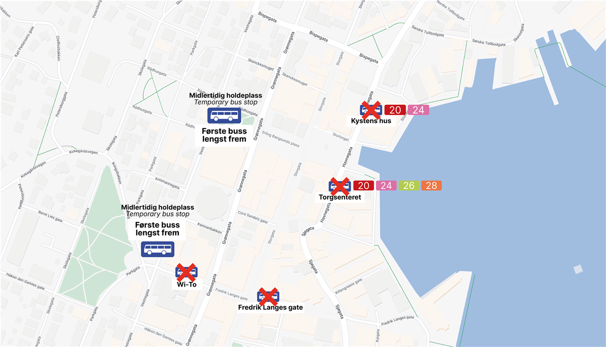 Tromsø sentrum er stengt mellom 05:15 og 18:30. Bussene har omkjøring i denne perioden, og flere sentrale holdeplasser vil ikke bli betjent.
